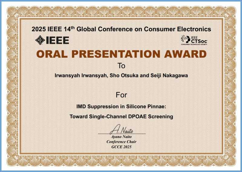 - Irwansyah, Sho Otsuka, Seiji Nakagawa, "IMD Suppression in Silicone Pinnae: Toward Single-Channel DPOAE Screening," IEEE 14th Global Conference on Consumer Electronics, 2025. (Type: International Conference) (doi: 10.1109/GCCE65946.2025.11275415) (@Osaka, JAPAN)